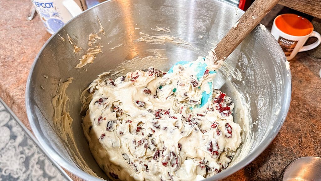 3. Stir in white chocolate chips and Craisins by hand. Spread evenly into the bottom of prepared pan. Bake in preheated oven for 18-22 minutes until set and golden brown at the edges. Don’t overbake or bars will be hard. Remove from oven and place pan on a wire rack to cool. Allow bars to cool completely before topping with frosting.